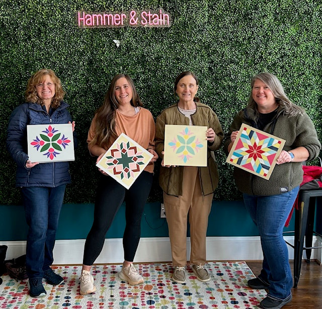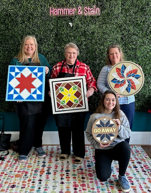 We are offering an amazing Barn Quilt Experience! You'll choose your sign size & pattern when you sign up online, prior to the workshop. Then the fun begins as you will choose your own paint colors to complete your unique Barn Quilt Sign during the experience. If applicable, please be sure to include your monogram in the personalization section of the registration. Please note that pricing varies by sign size or project & frames are not included in the workshop. All supplies needed are included in the workshop. No experience needed! We'll guide you through the entire process! Please reach out to us with any questions.