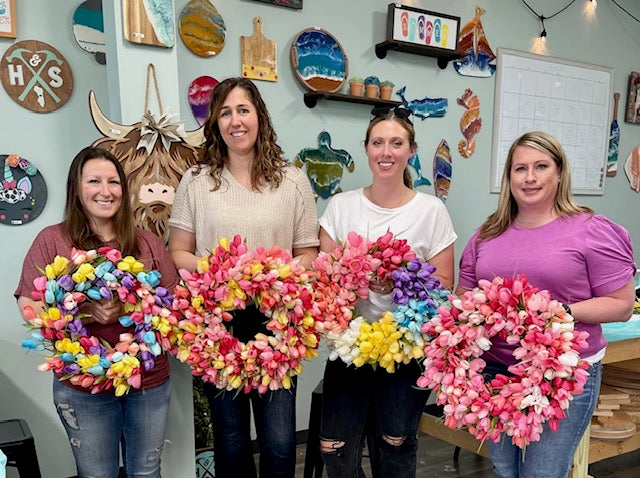 Join us for our amazing Blossoms & Bellinis: A Tulip Wreath Making Experience! We'll enjoy a relaxing morning of fresh Spring vibes & creativity while sipping on a bellini!