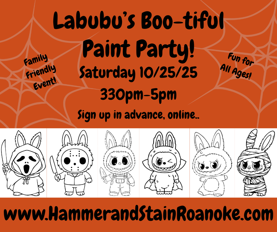 This event is all about Halloween Labubu!! It's a Boo-tiful Labubu Paint Party! Get ready to add a spooky touch to your fall decor! In this family friendly, fun, hands-on experience you'll paint on an 11"x14" canvas & create your own Halloween Labubu!