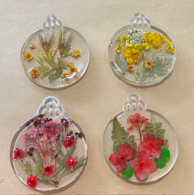You will choose your own add-ins to create your resin art project. We will have a variety of festive holiday polymer clay pieces, mica colors, inks, pressed flowers, sand, etc available so you can create your own, unique works of resin art. These resin pieces are so much fun to make & are fabulous gift giving ideas! What better way to share a memory from the heart!