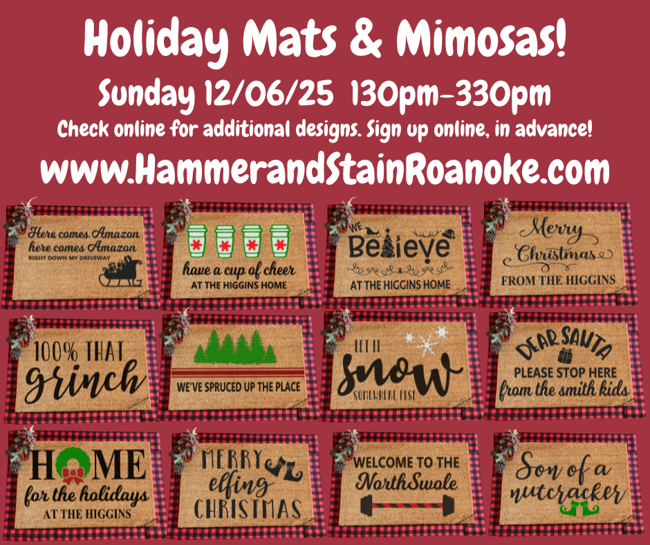 Select your design from the options below & complete the registration.  Doormats are approximately 18"x30". Please be sure to include any personalization information in the registration, if applicable. All those in attendance must be registered for their own project. Please contact us with any questions.