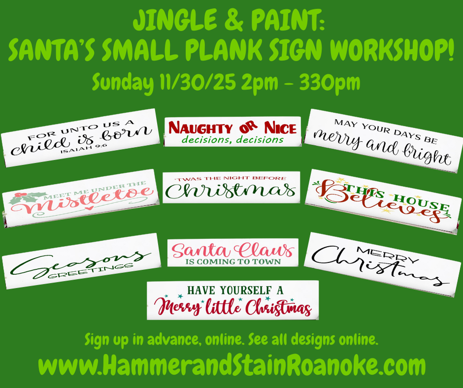 11/30/25 (Sunday) Jingle & Paint: Santa's Small Plank Sign Workshop! 2pm - 330pm